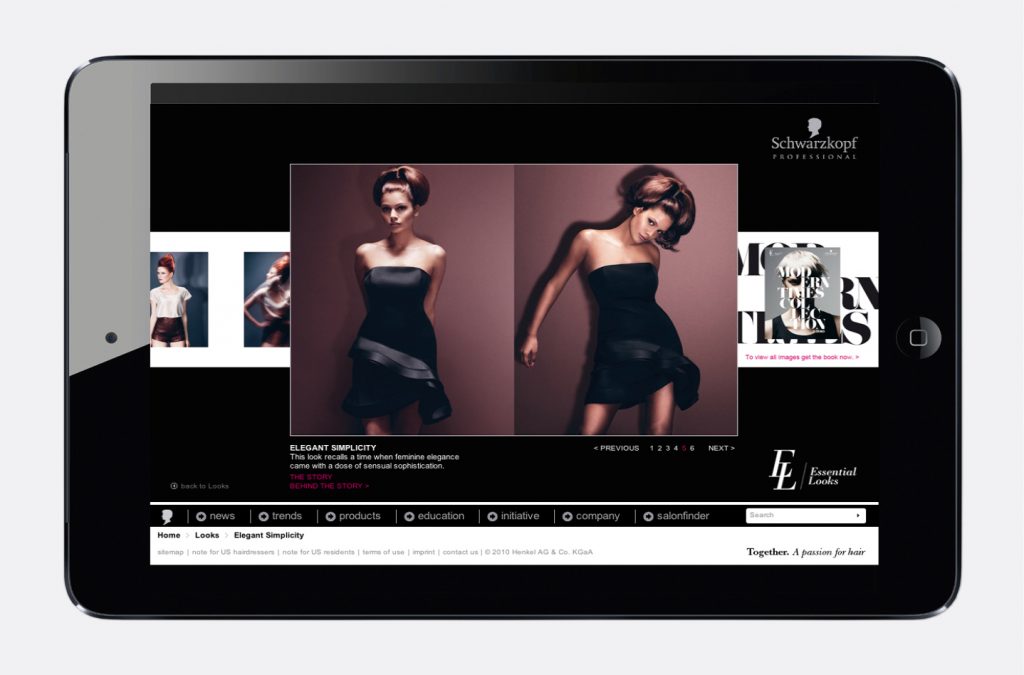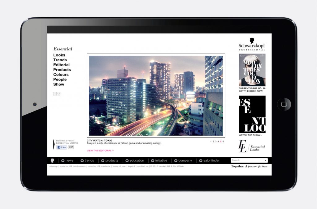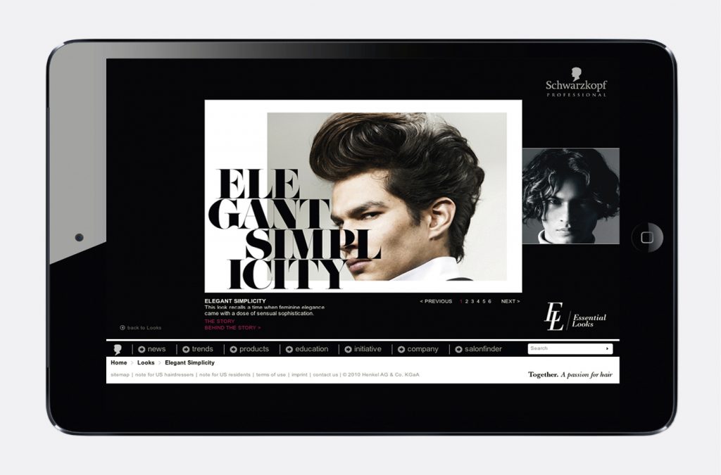 Development of the design for the global ESSENTIAL LOOKS Trendbook, which presents Schwarzkopf Professional as an inspiring partner for the latest trends in hair cut, colour, care and styling with a bound premium issue, website and film.