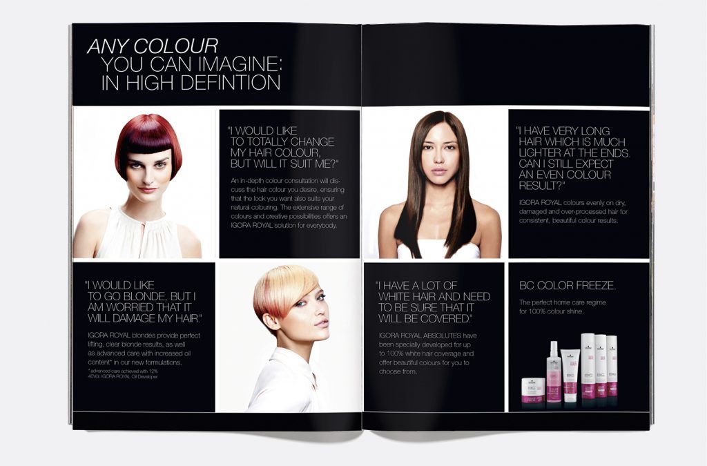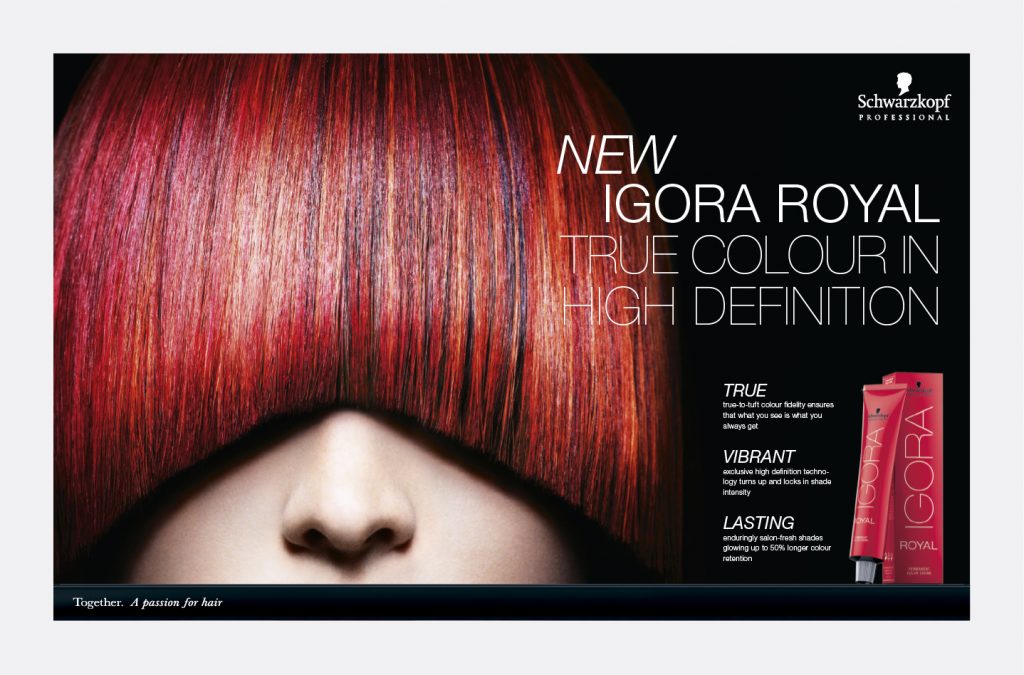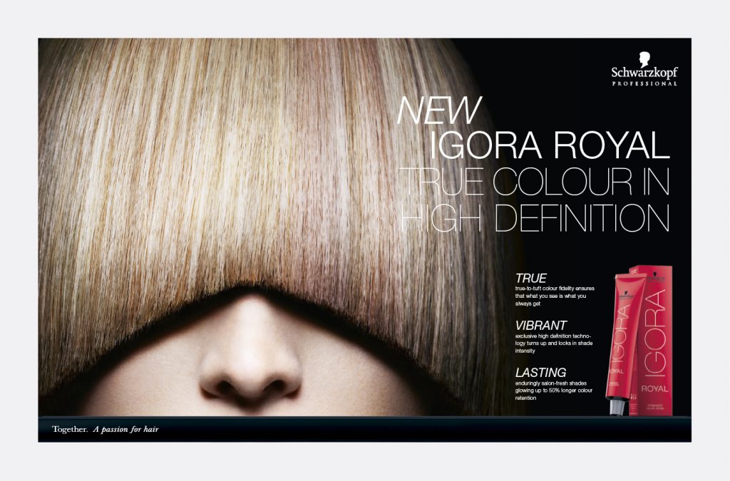 Relaunch of IGORA ROYAL that delivers particularly precise colour. Refraining from exaggerated advertising promises, we show the true colour that consumers can expect from this product. Development of sales folder, mailings, POS materials and a film.